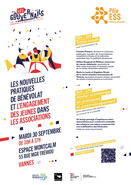 Fransez Poisson, docteur en sciences politiques, membre de Coop’Eskemm, coopérative d’études et de recherches spécialisée dans les politiques de jeunesse/ Hélène Bougaud et Mathieu Jeanvrain, membres Cœurs résistants, association engagée dans la lutte contre la précarité et l’exclusion sociale, notamment par le soutien alimentaire/ Marie Le Lesle et Ségolène Rivals de la Jeune Chambre Économique de Vannes, association de jeunes citoyen·ne·s porteur·se·s de projets d’intérêt général sur le territoire